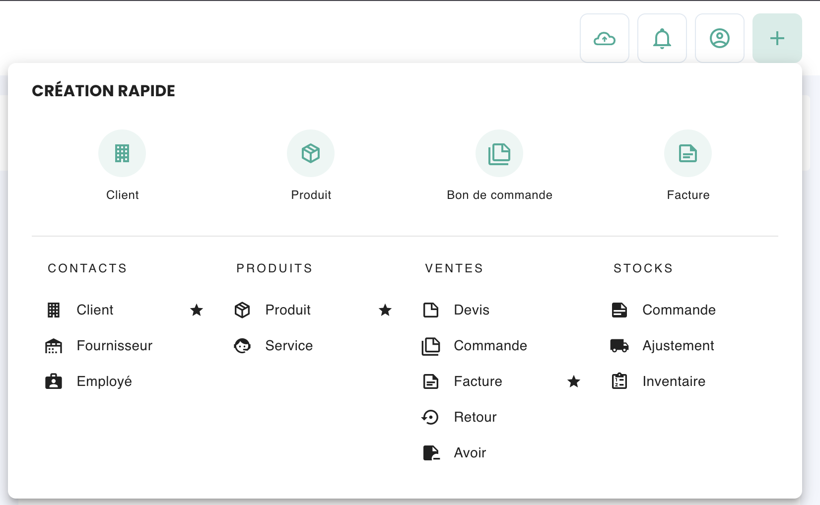 Depuis n'importe quelle page sur Erplain, vous pouvez créer des documents, contacts et ajustements de stock en ouvrant le menu Accès rapide :