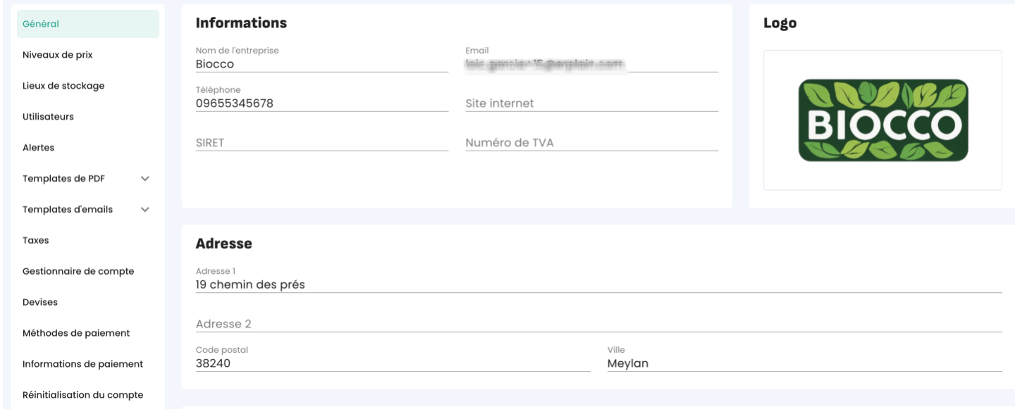 Les paramètres de l'entreprise permettent d'ajouter l'adresse de votre entreprise ansi que votre logo. Le logo apparaîtra sur tous vos documents PDF.