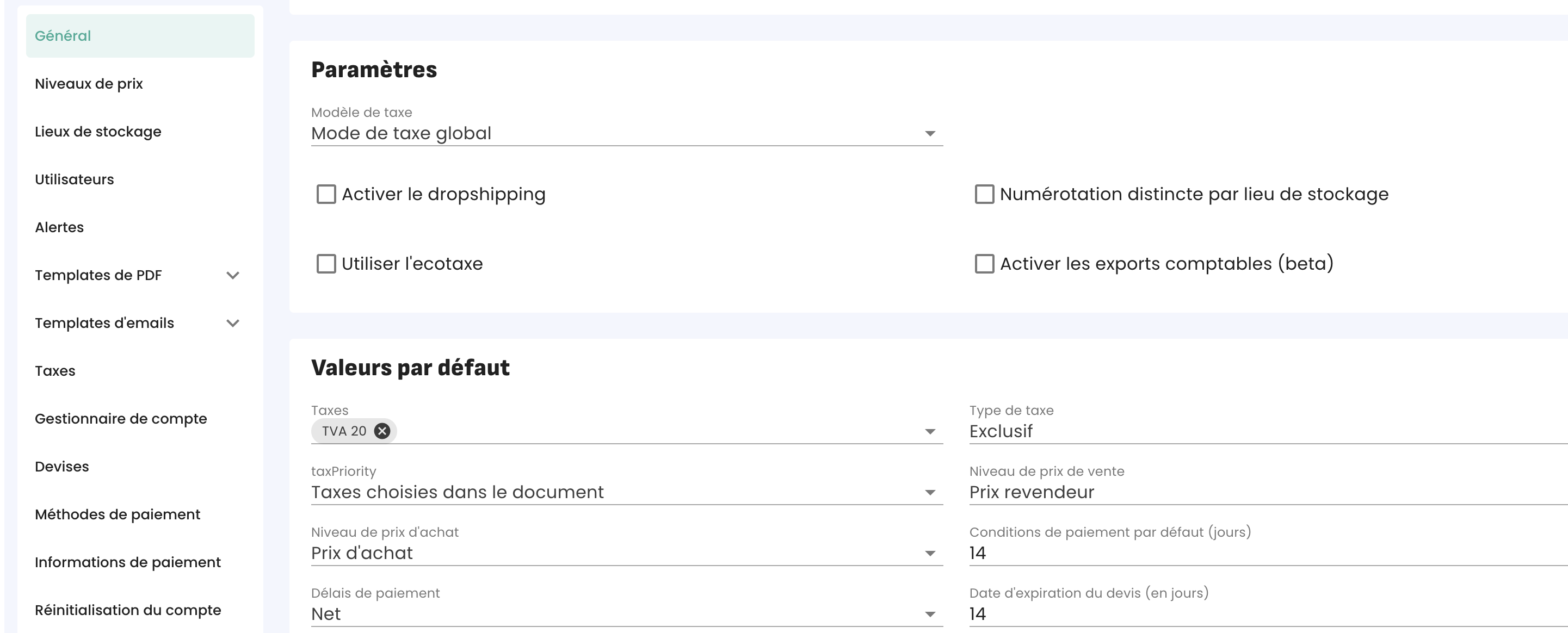 Type de taxes : Ces réglages change la manière dont erplain calcule les taxes.
