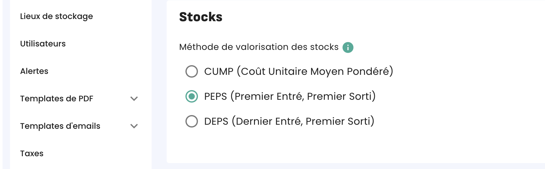 Vous pouvez également choisir la méthode de calcul de la valorisation des stocks, avec un choix possible entre le Coût Unitaire Moyen Pondéré, le Premier Entré Premier Sorti et le Dernier Entré Premier Sorti.
