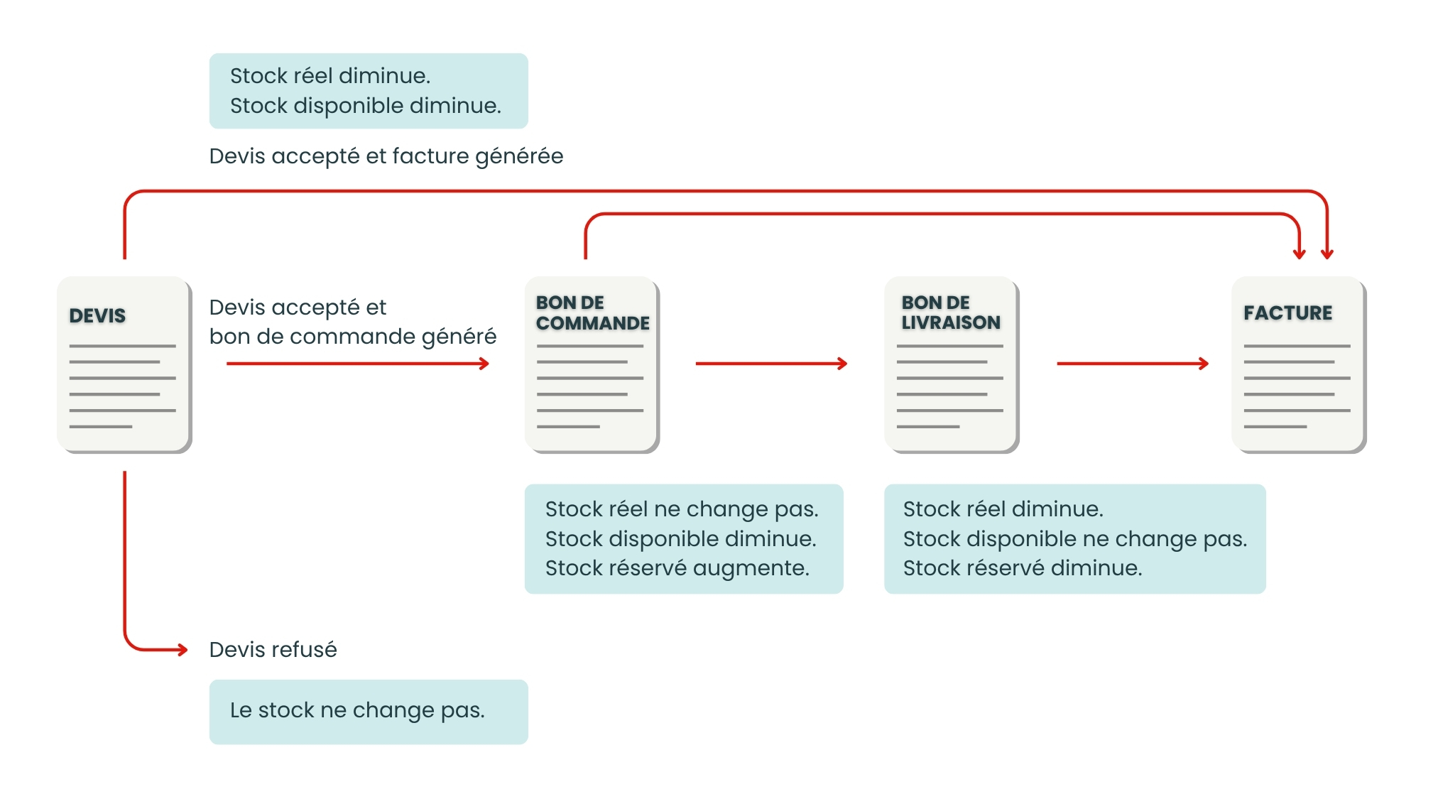 • Le stock disponible est égal aux quantités dans le stock réel moins les quantités inclus dans des bons de commande client mais pas encore dans les bons de livraison. Ce dernier s'appelle le stock réservé.