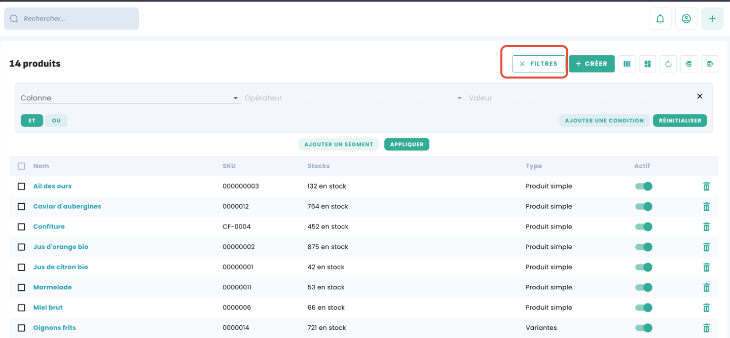 Vous pouvez également filtrer vos produits en fonction de vos fournisseurs, marques ou tags en cliquant sur "filtres" :