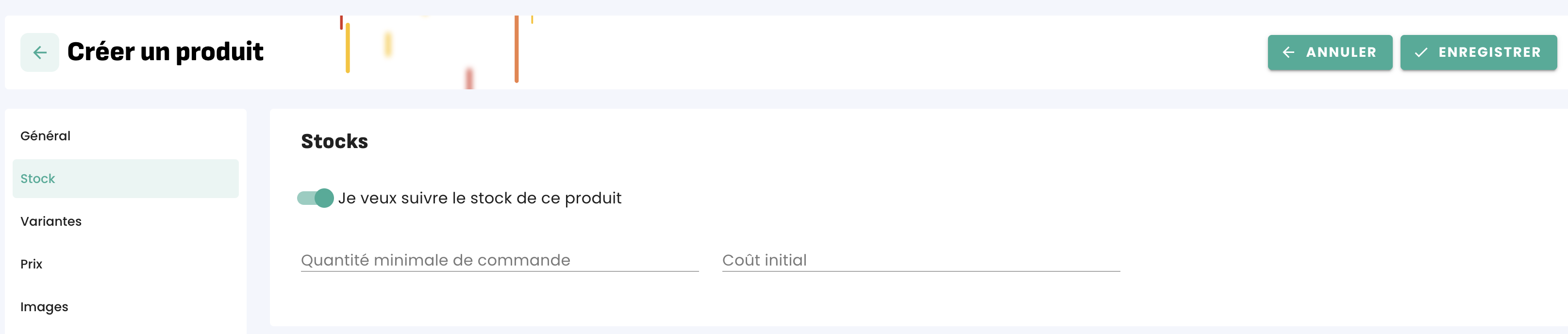Les catégories liées aux images, au stock, aux variantes ou aux prix sont disponibles à gauche de l'écran. Vous pouvez alors activer ou désactiver le suivi des stocks, ainsi qu'ajouter un stock et un coût initial.