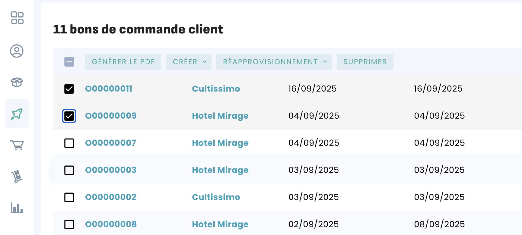- Supprimer un document entraine également la suppression des documents générés à partir de celui-ci. Par exemple, la suppression d'un devis supprimera le bon de commande ou la facture créée depuis le devis.