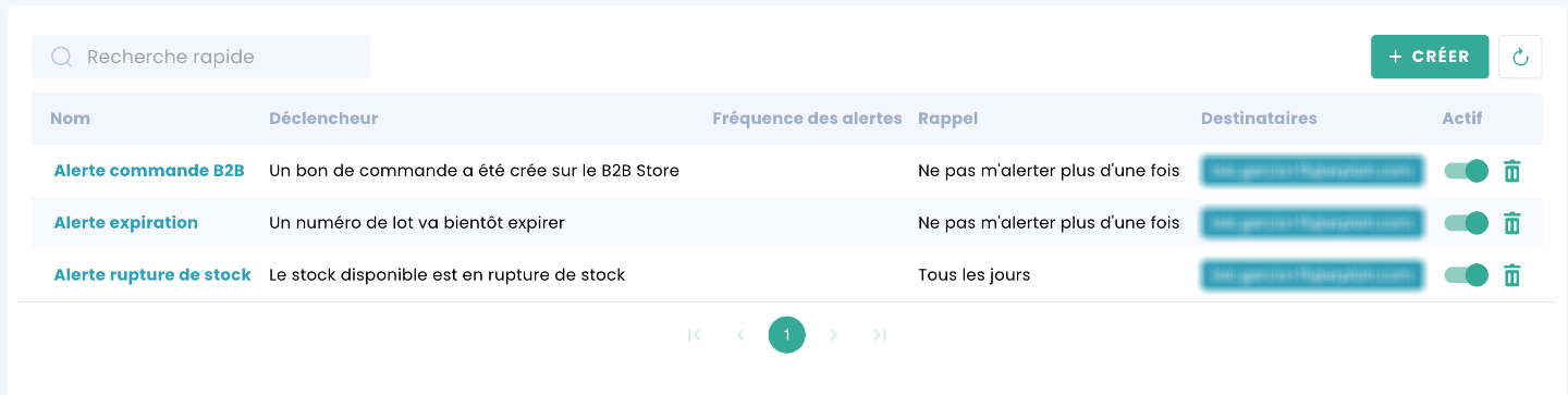 - Pour créer une nouvelle alerte, cliquez sur le bouton "+ CRÉER".