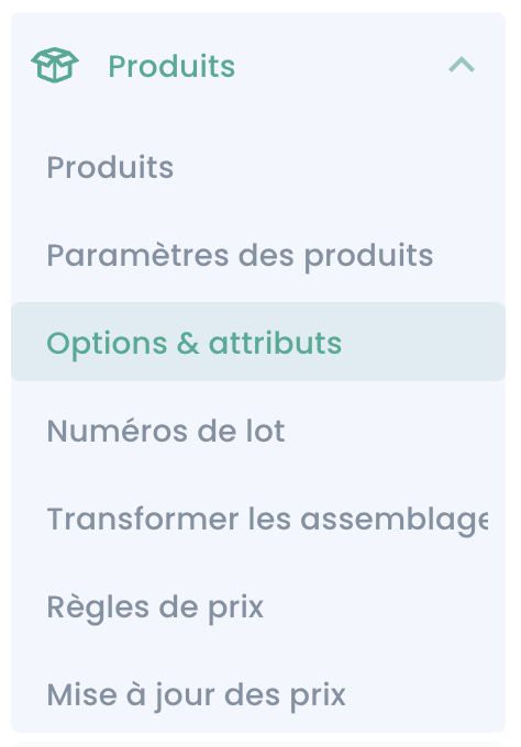Pour créer et gérer vos attributs et options, allez dans le menu "Produits" > "Options & attributs" :