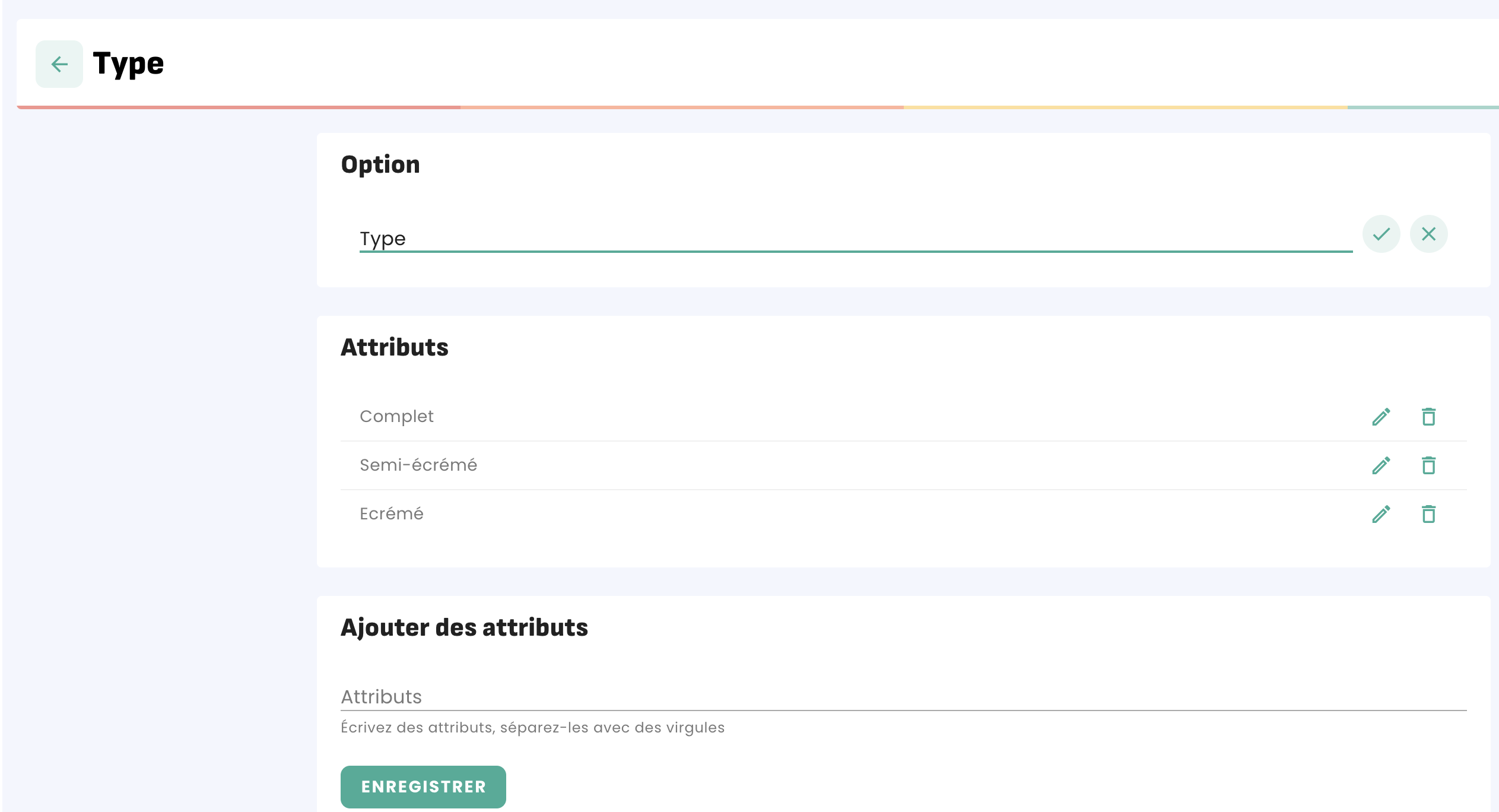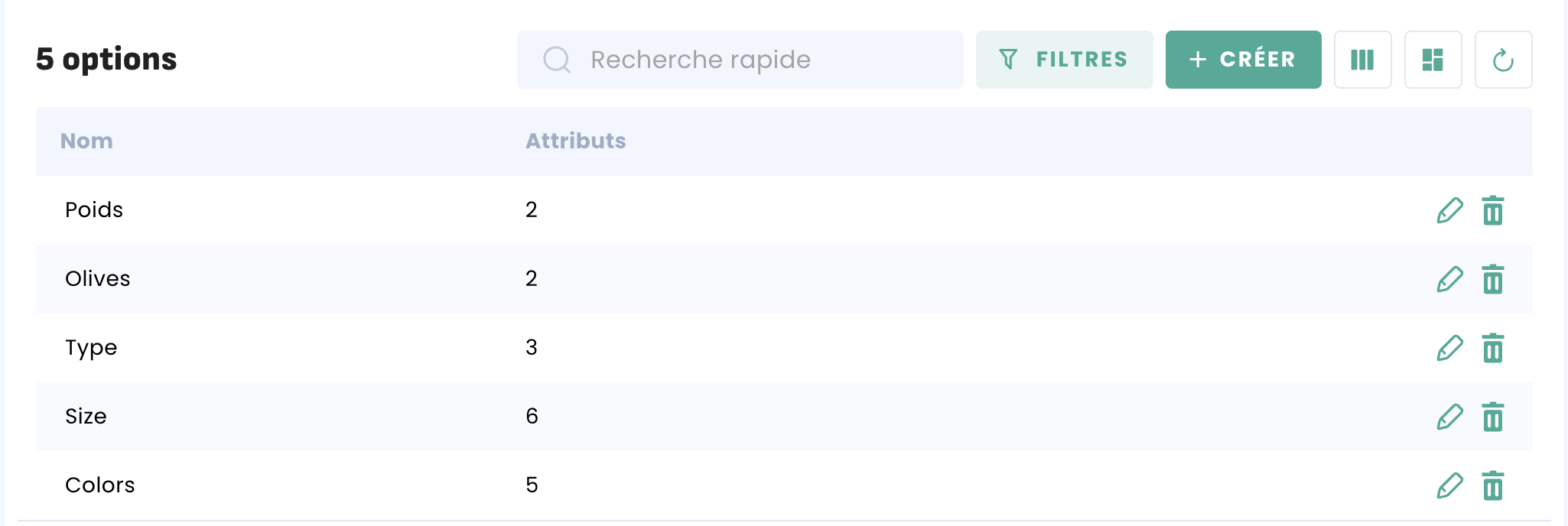 Vous verrez alors la liste de vos options avec pour chacun leur nombre d'attributs. Dans cet exemple, "Type" est une option et "Complet", "semi-écrémé" et "Ecrémé" sont des attributs :