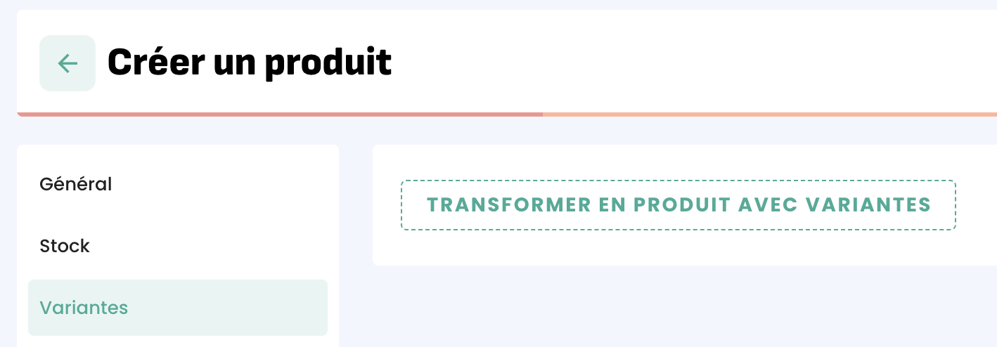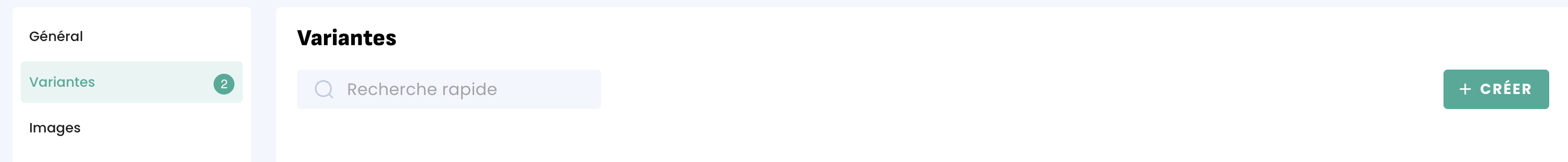 1. La création de variante peut se faire directement dans le formulaire de création de produit. Cliquez sur Produits > "+ CRÉER" > "Variantes".