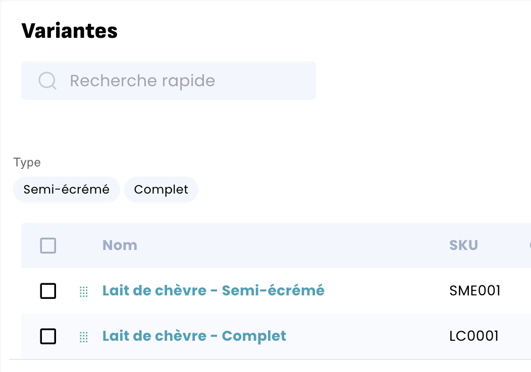 - Chaque variante a son propre niveau de stock et peut également avoir son propre SKU (référence produit) et prix.