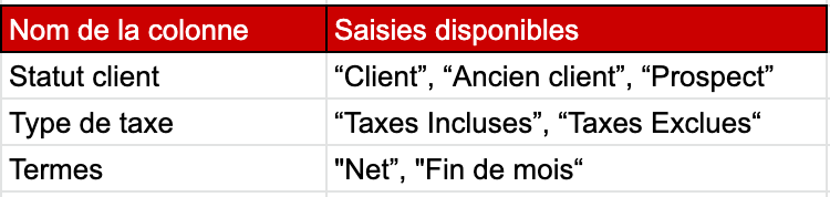 Les saisies disponibles : Dans les colonnes "statut client", "type de taxe" et "termes", il est possible de saisir uniquement un mot ou groupe de mots parmi les saisies disponibles. Ci-dessous vous trouverez un récapitulatif des saisies disponibles pour chaque colonne concernée :
