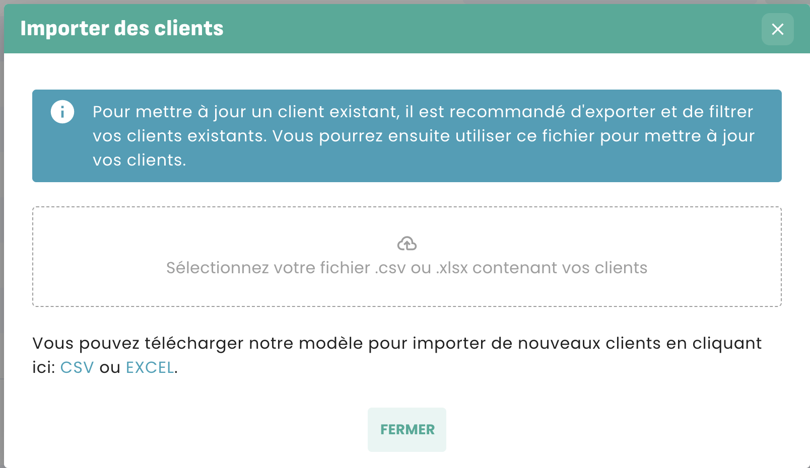 Importer de nouveaux clients se fait directement depuis le Menu clients grâce au fichier d'export disponible en modèle en cliquant sur "importer d'un fichier".