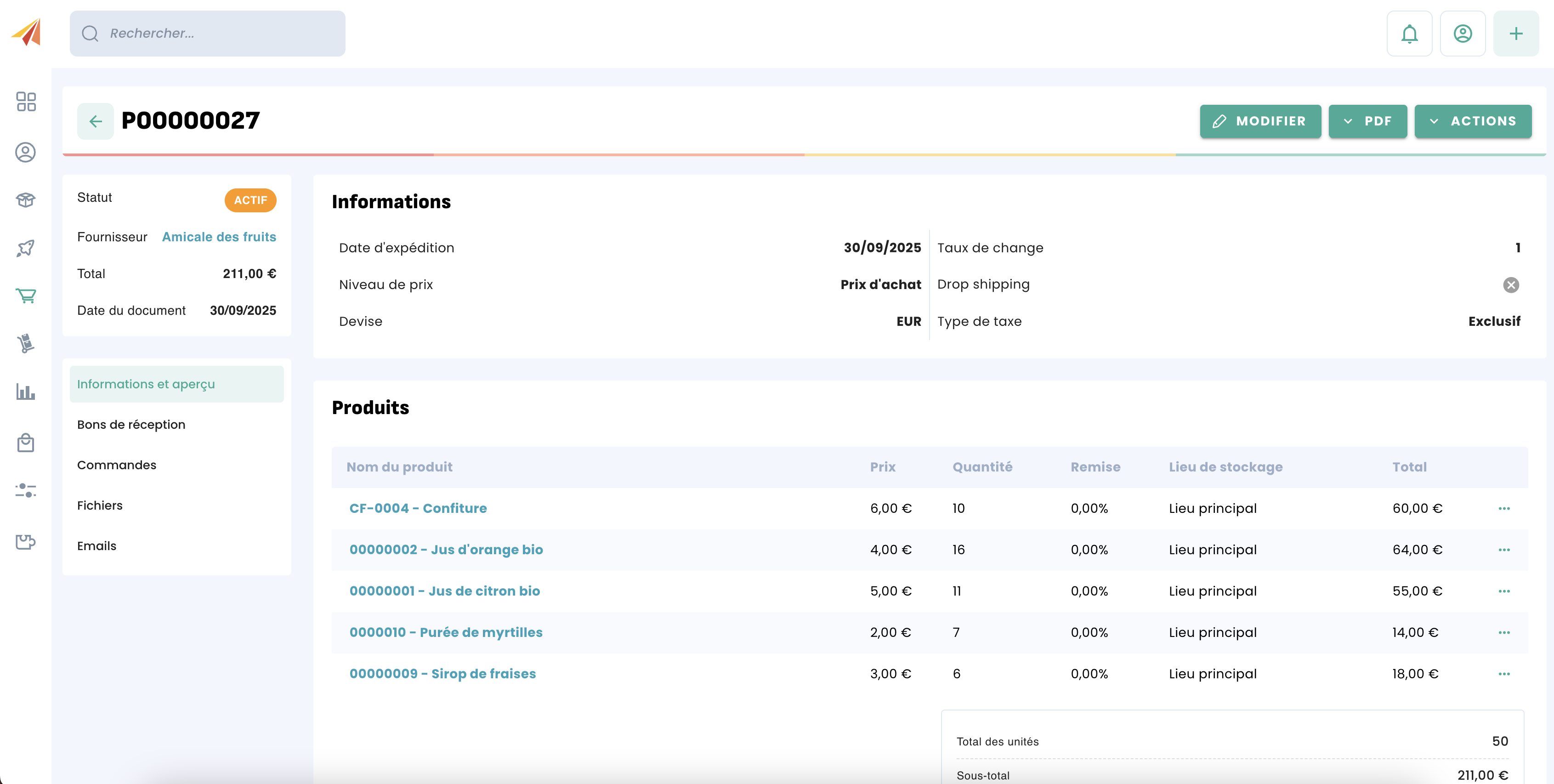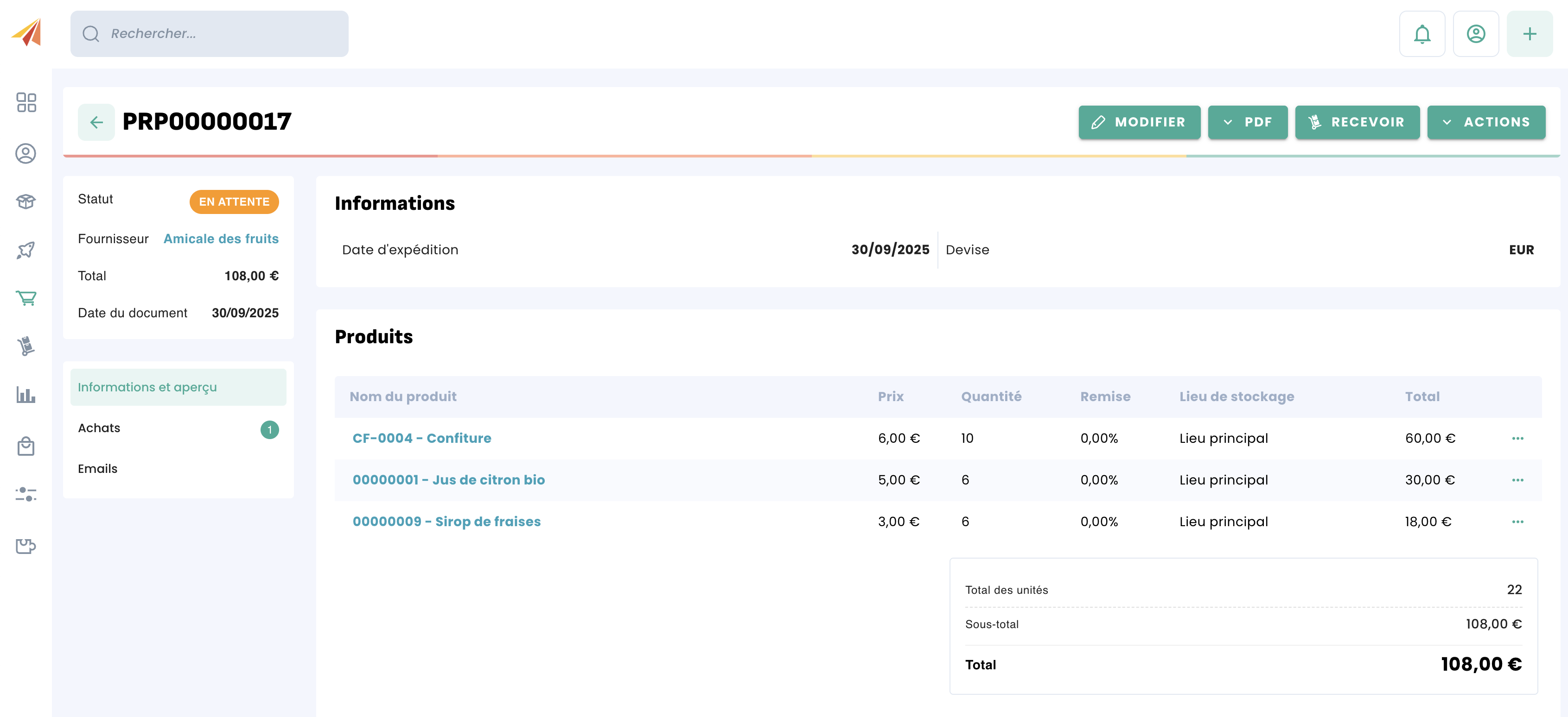 Erplain permet aux utilisateurs de recevoir une commande de réapprovisionnement en plusieurs échéances, au même titre qu'il est possible de créer plusieurs bons de livraison pour une commande client expédiée en plusieurs fois. Cela peut être utile si un fournisseur fait face à des problèmes et ne peut envoyer toute la commande ou si vous souhaitez étaler dans le temps la réception d'une commande.