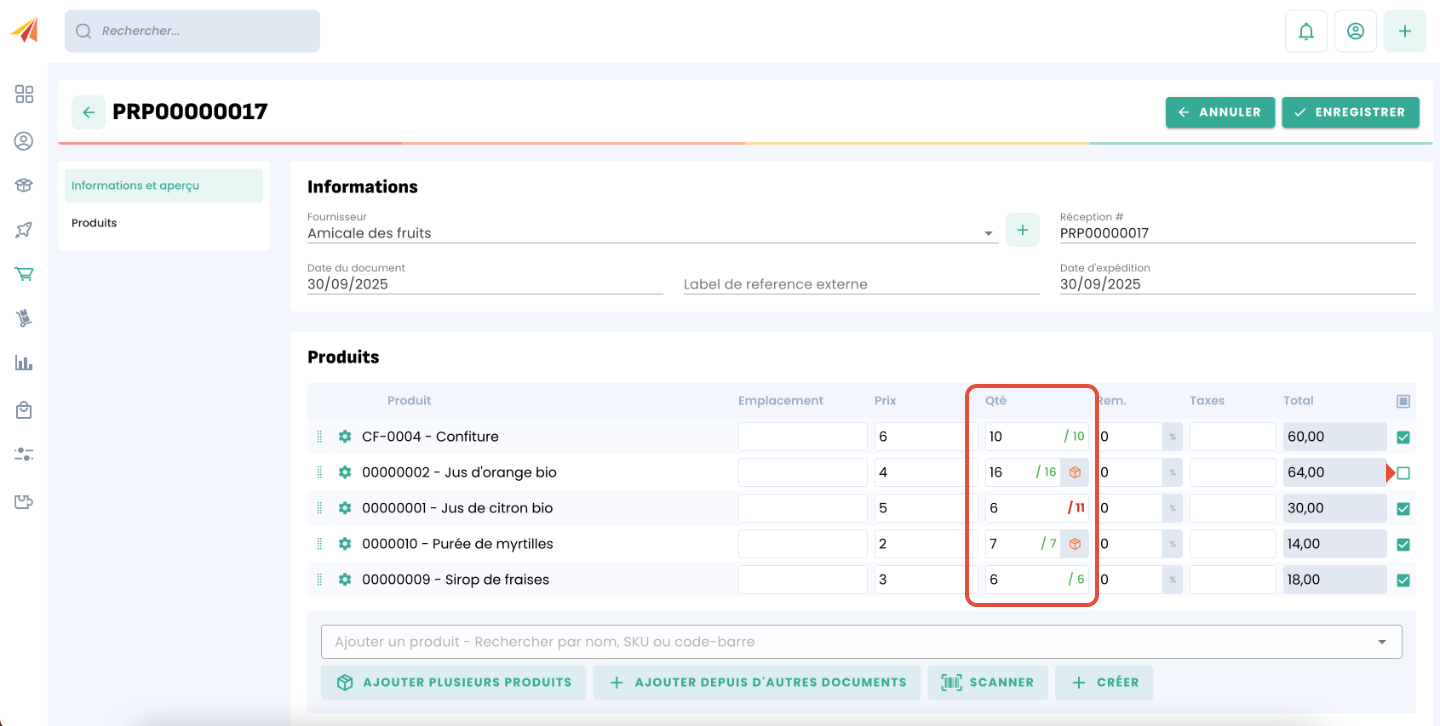 Une fois l'ordre d'achat créé, vous pouvez commencer la réception des produits. Cela passe par la création d'une bon de réception. Vous n'avez alors qu'à ajuster manuellement les quantités de chaque produit selon ce qui sera expédié. Il est aussi possible de décocher un produit pour le retirer totalement d'une livraison.