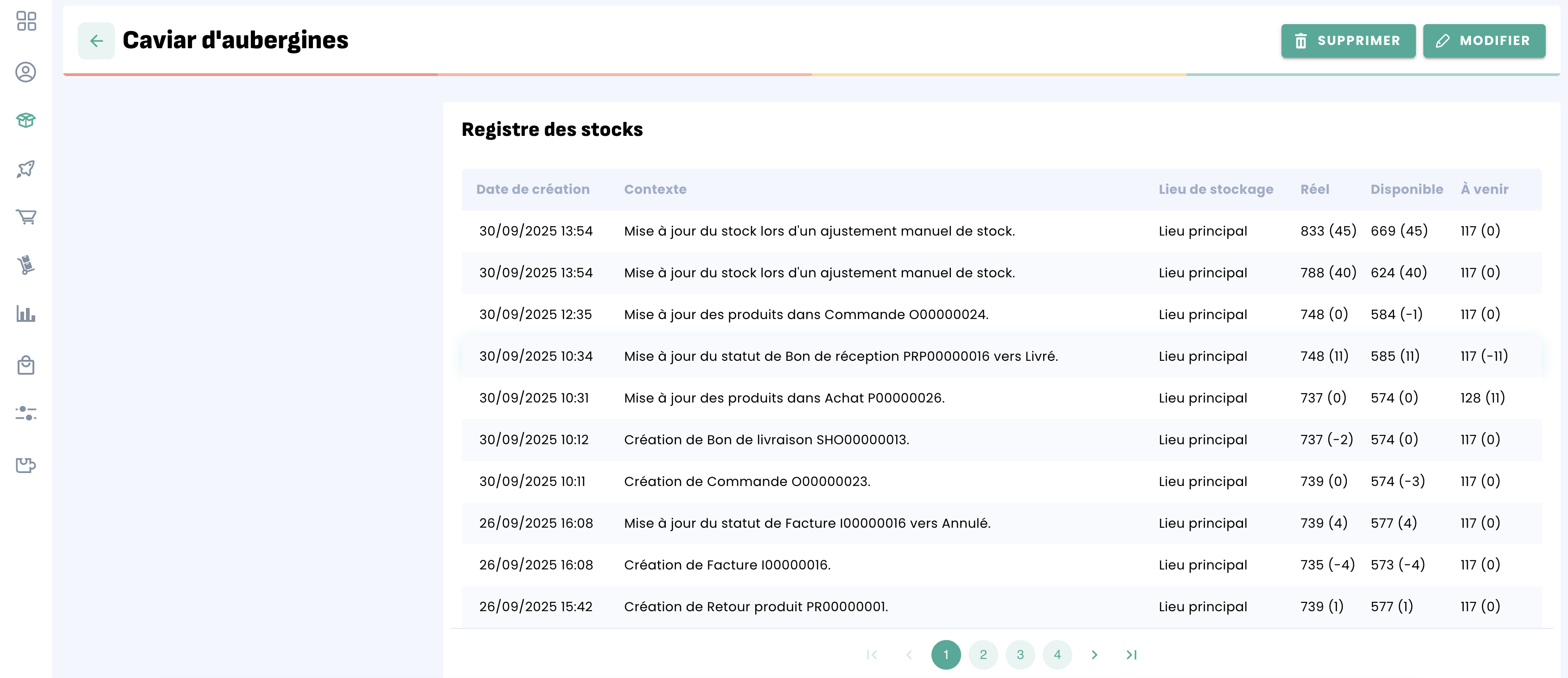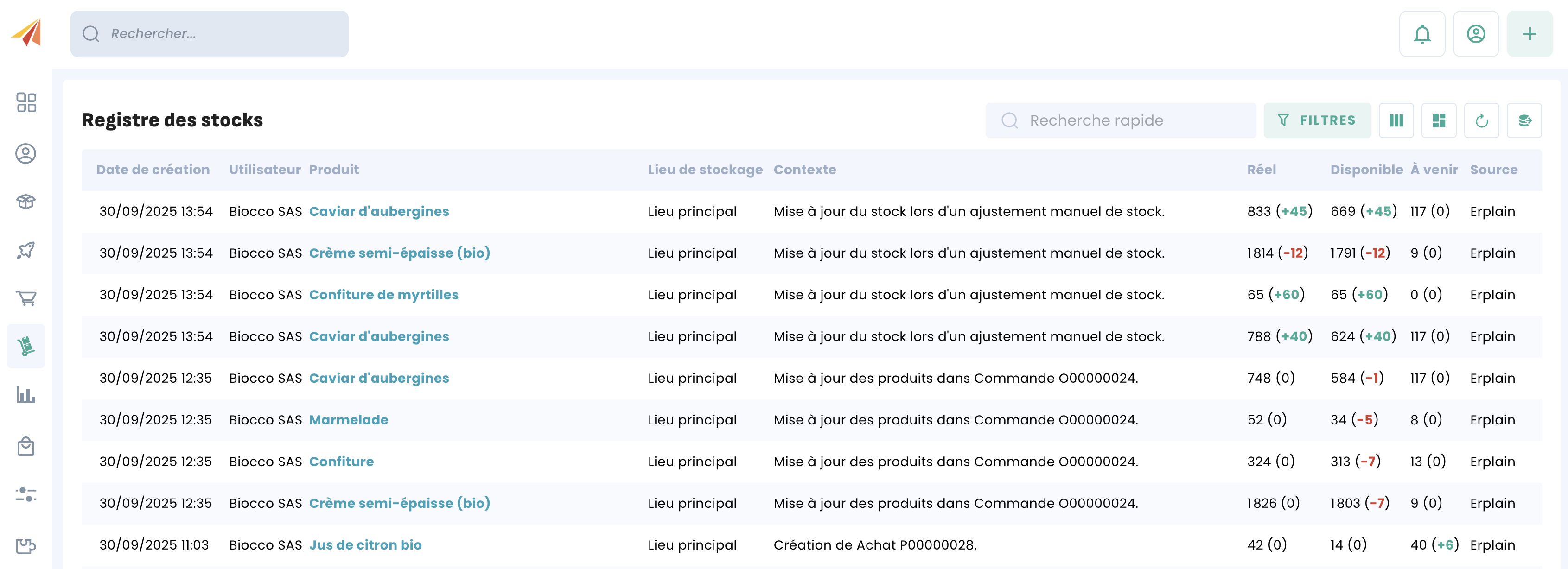 Le registre des stocks liste toutes les transactions qui ont mis à jour le stock.