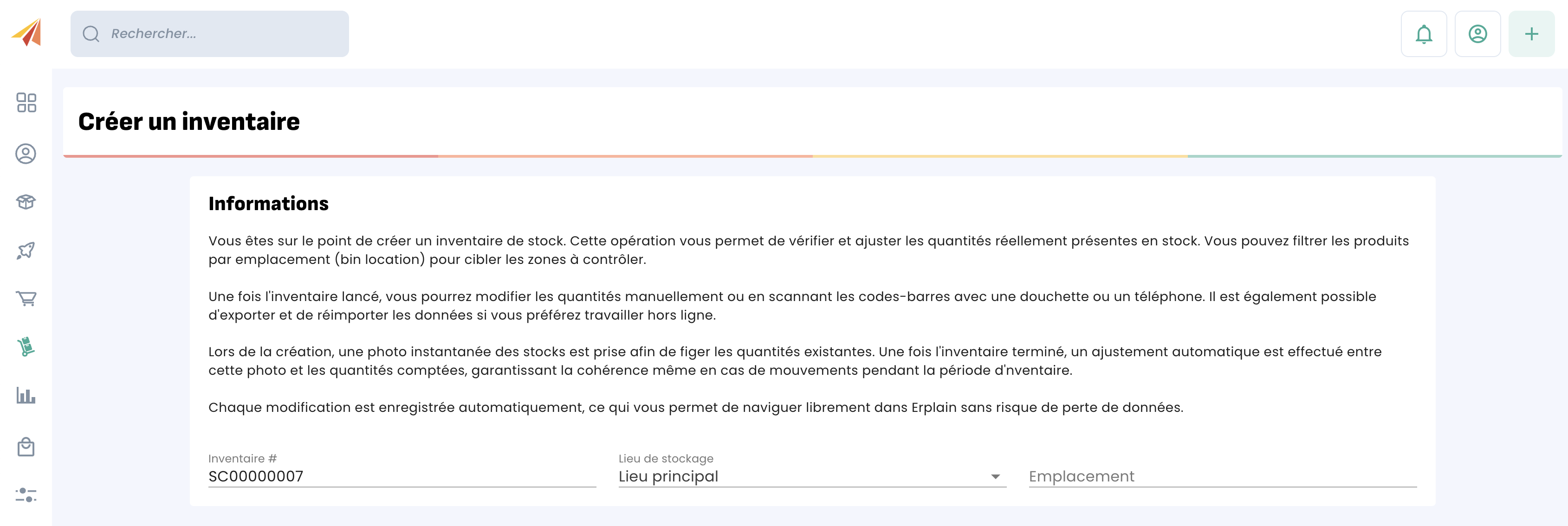 Cela peut être fait dans chacun de vos lieux de stock, avec la possibilité d'ajouter un emplacement plus précis afin de faire un inventaire d'une zone spécifique.