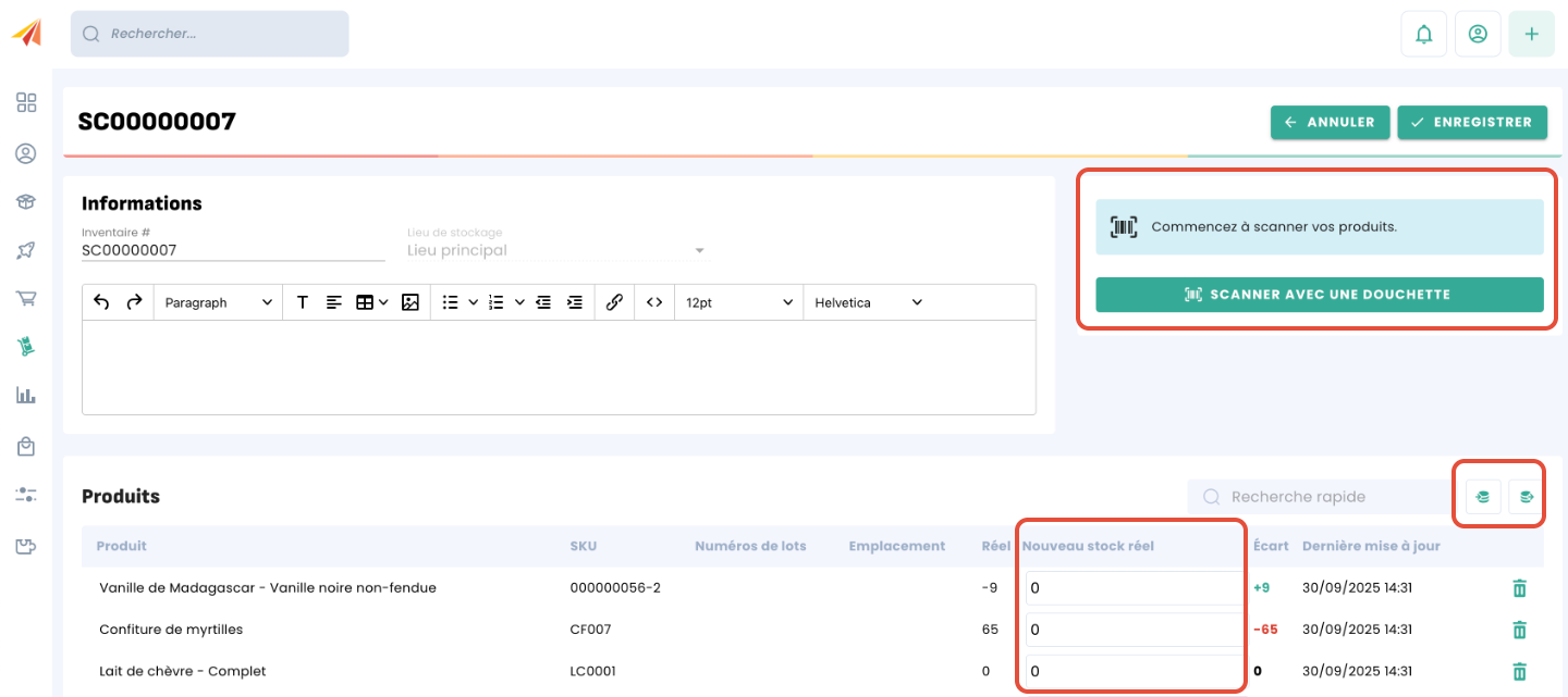 AVERTISSEMENT : Lors de la création d'un nouvel inventaire, la colonne stock réel des produits commence à 0. N'oubliez pas de rajouter la quantité de stocks de vos produits avant de valider pour éviter de remettre vos stocks à 0 par inadvertance.