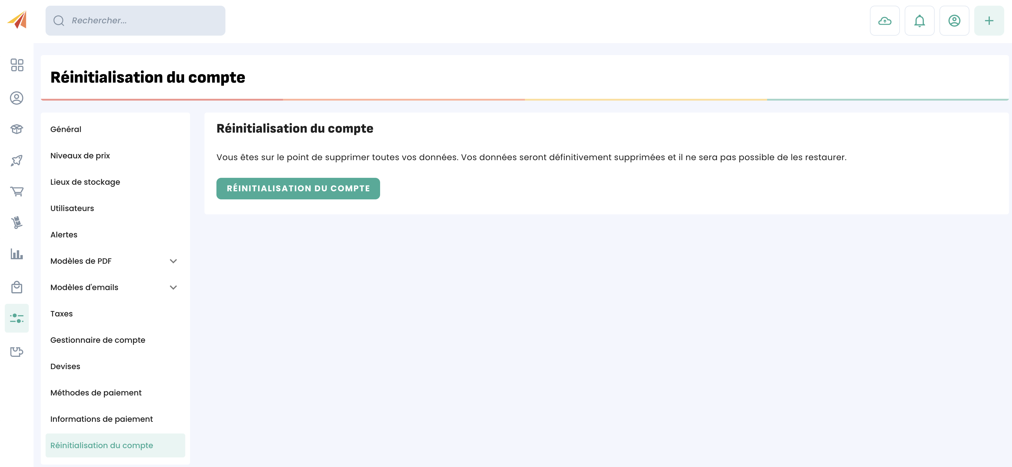 Si vous désirez effacer le contenu de votre compte ou simplement effacer les données de test, vous pouvez aller dans le menu Paramètres > Réinitialisation du compte :