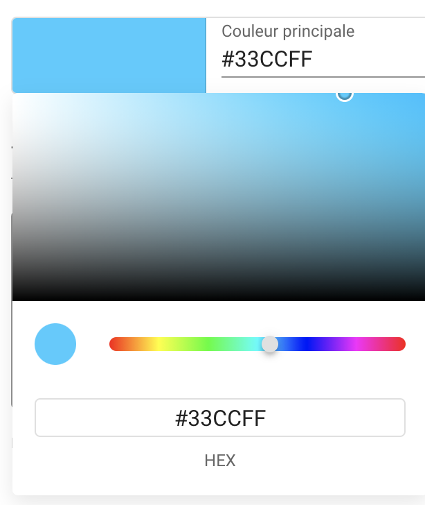Les couleurs principales et secondaires seront utilisées pour personnaliser votre boutique, comme le montre l'exemple ci-dessous. Sélectionnez la couleur HEX ou cliquez dans la case de couleur :