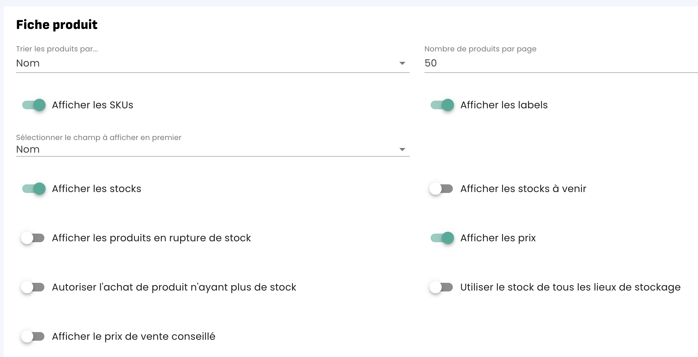 Dans cette section, vous pouvez personnaliser les informations que vous souhaitez faire apparaître vis-à-vis de vos produits. Vous pouvez par exemple choisir d'afficher les stocks disponibles mais pas les stocks à venir, ou bien de cacher les produits en rupture de stock.