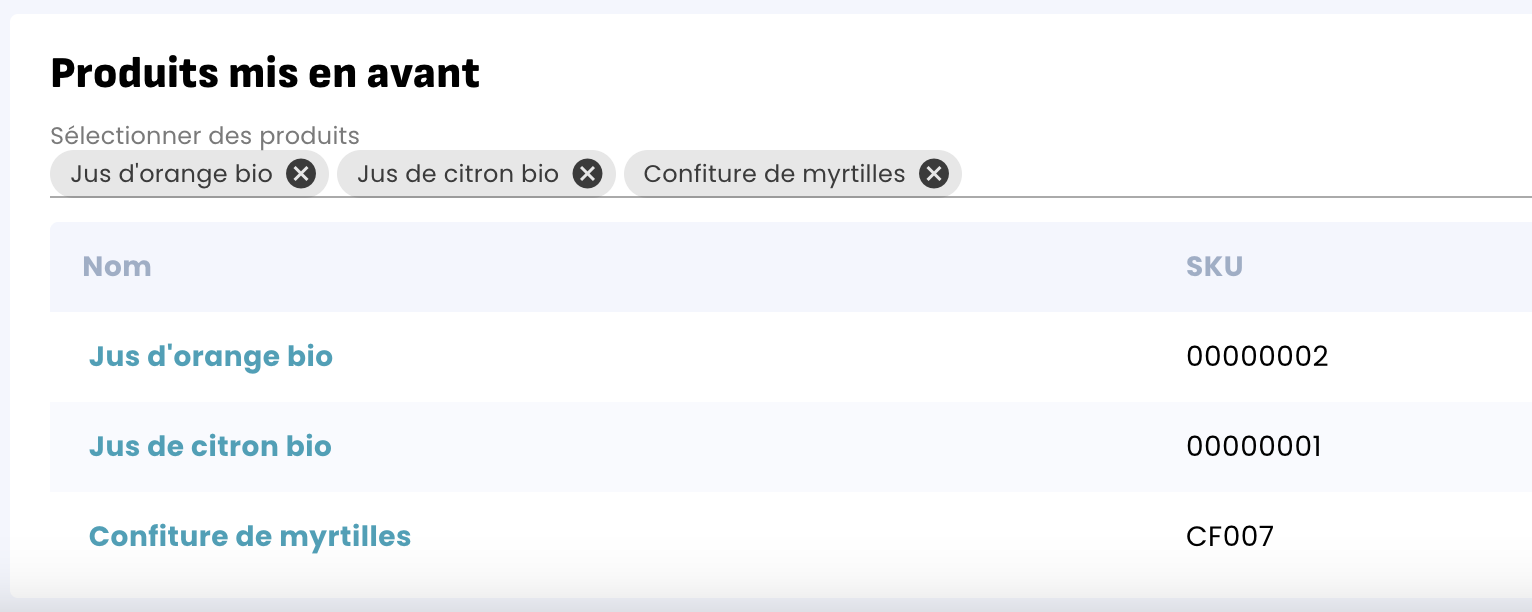 Vous pouvez aussi sélectionner quelques produits que vous souhaitez présenter en haut de la sélection de produits. Par exemple, vous pouvez utiliser cette fonctionnalité pour mettre en évidence des produits populaires ou des produits en promotion.