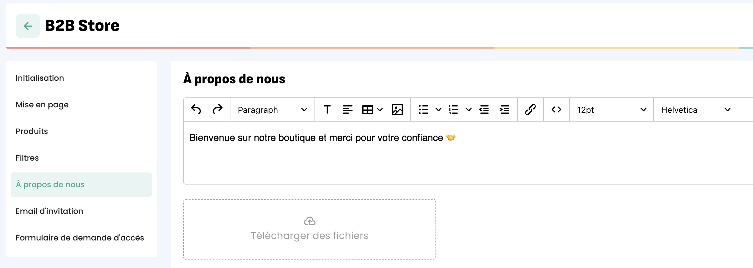 Dans cette section, vous pouvez créer une page "À propos de nous". Elle sera affichée sur votre boutique pour donner des informations supplémentaires sur votre entreprise.